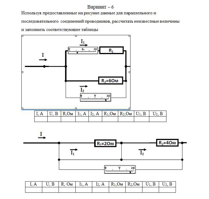 Используя предоставленные на рисунке данные для параллельного и последовательного соединений проводников, рассчитать неизвестные величины и заполнить соответствующие таблицы.