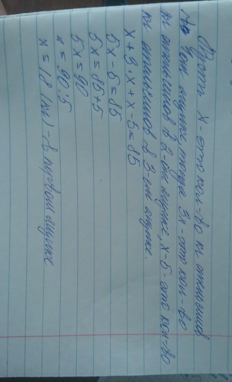 В трёх ящиках лежит 85кг апельсинов.Во втором ящике апельсинов в 3раза больше,чем в первом, а в третьем на 5кг меньше, чем в первом. Сколько килограммов апельсинов лежит в первом ящике?