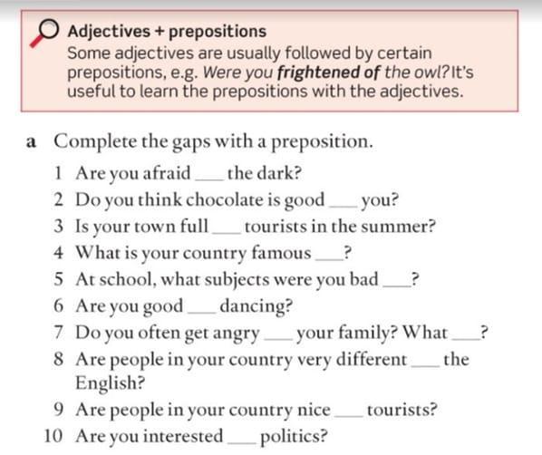 Some adjectives are usually followed by certain prepositions, e. g. Were you frightened of the owl? It's useful to learn the prepositions with the adjectives.