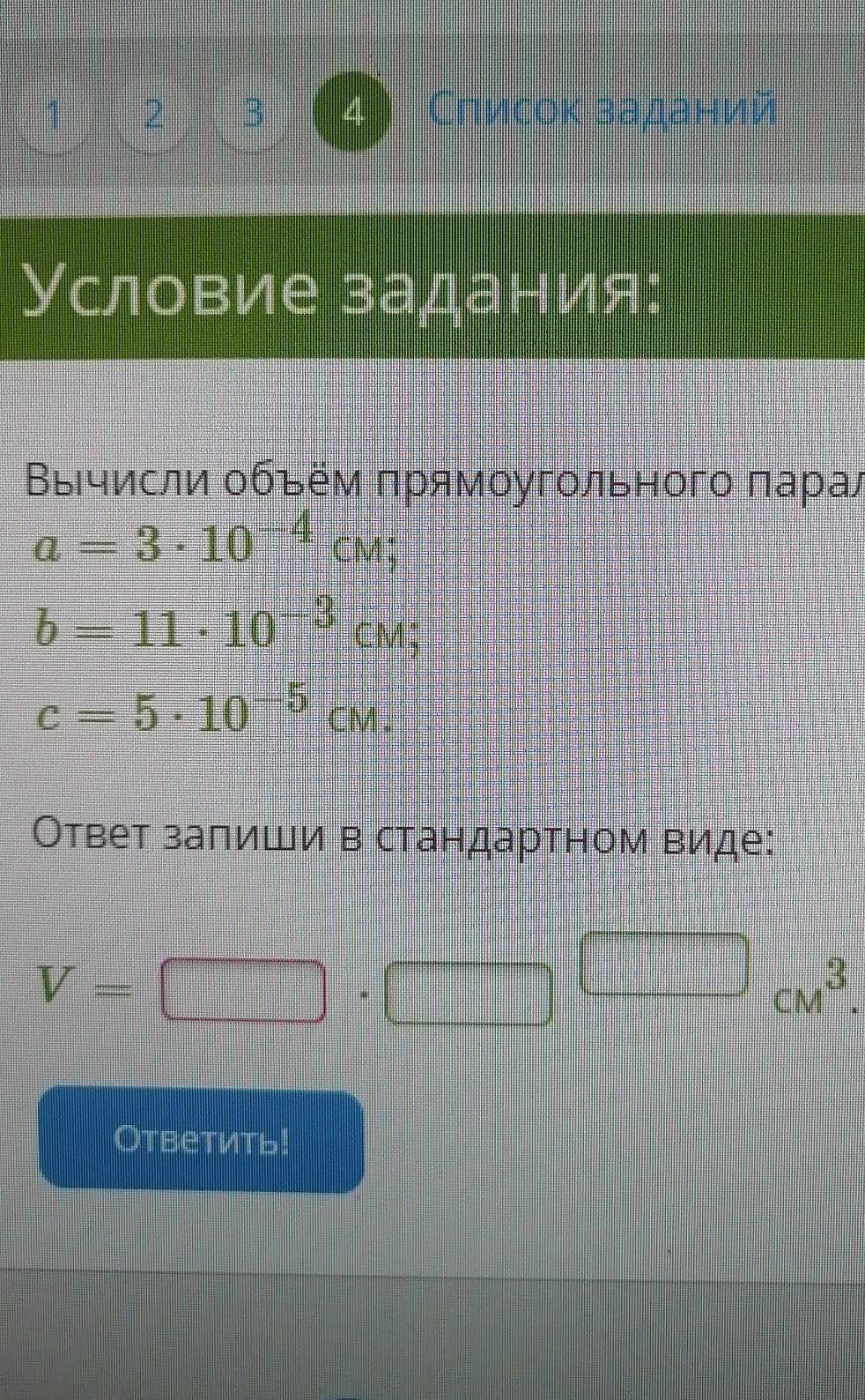 Вычислите объем прямоугольного параллелепипеда, если a, b, c - ребра параллелепипеда :