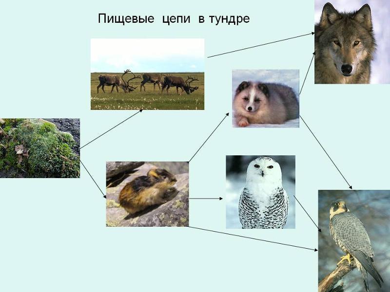 растения⇒лемминг⇒куропатка⇒олень⇒сова⇔песец⇔волк.