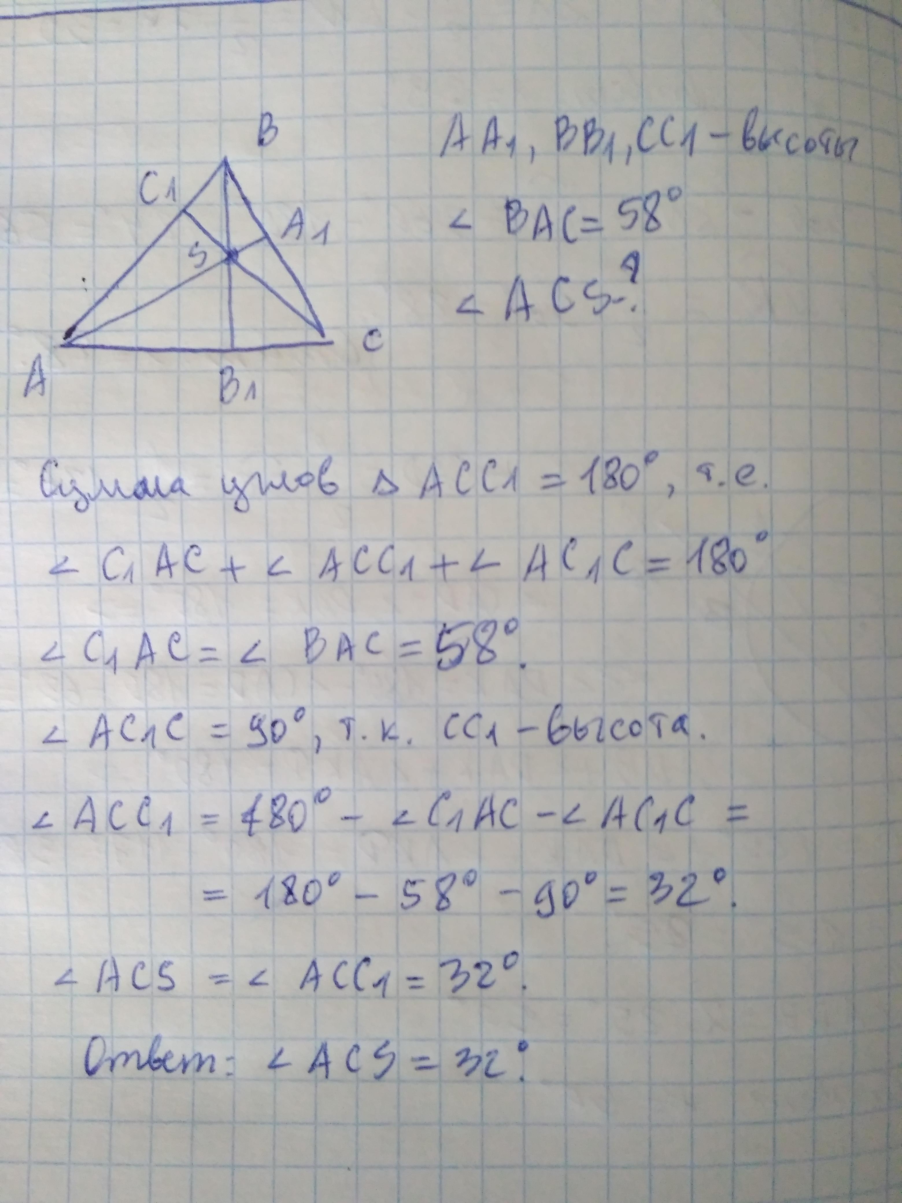 Высоты треугольника АВС пересекаются в точке S. Найдите угол ACS, если угол ВАС равен 58 градусов.