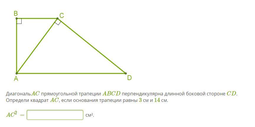 ДиагональAC прямоугольной трапеции ABCD перпендикулярна длинной боковой стороне CD. Определи квадрат AC, если основания трапеции равны 3 см и 14 см.
