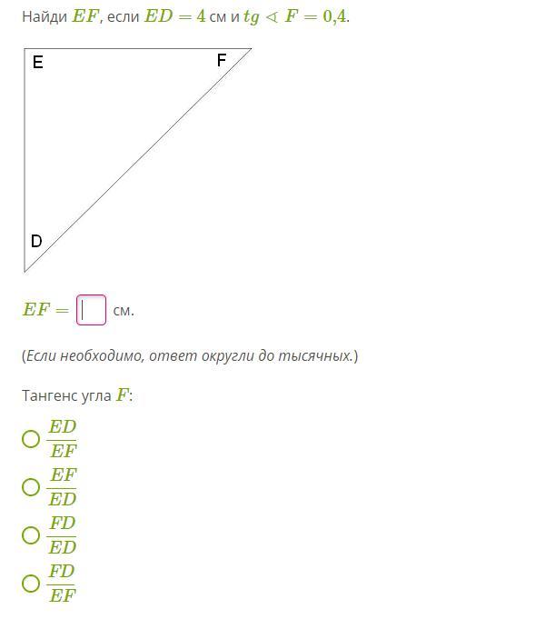 Найди EF, если ED= 4 см и tg∢F=0,4.