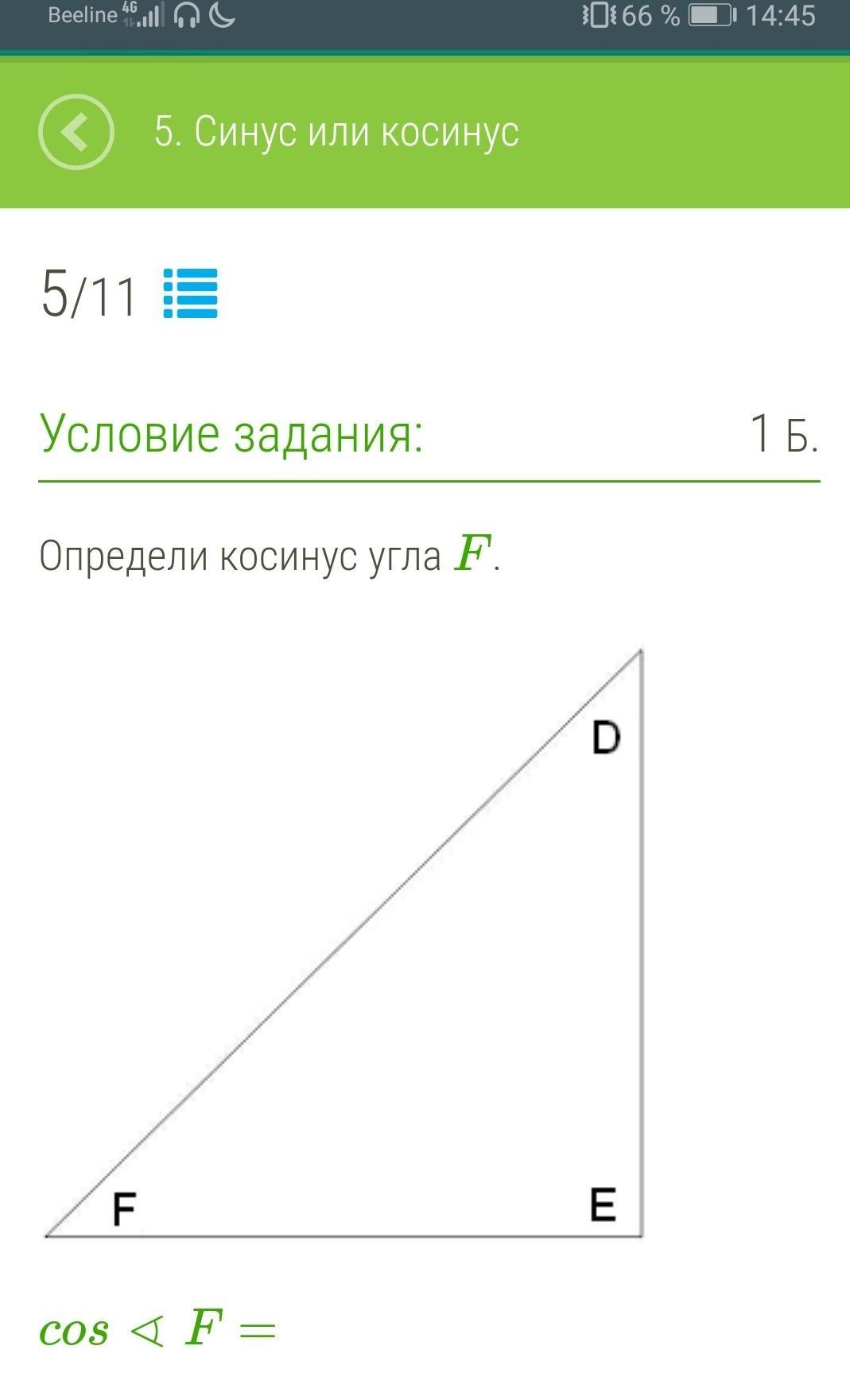 Косинус угла равен отношению прилежащего катета к гипотенузе.