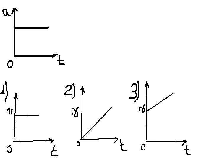 Какой из графиков зависимости скорости от времени, приведенных на рисунке(нижние три) соответствует графику зависимости ускорения тела от времени(верхний)?