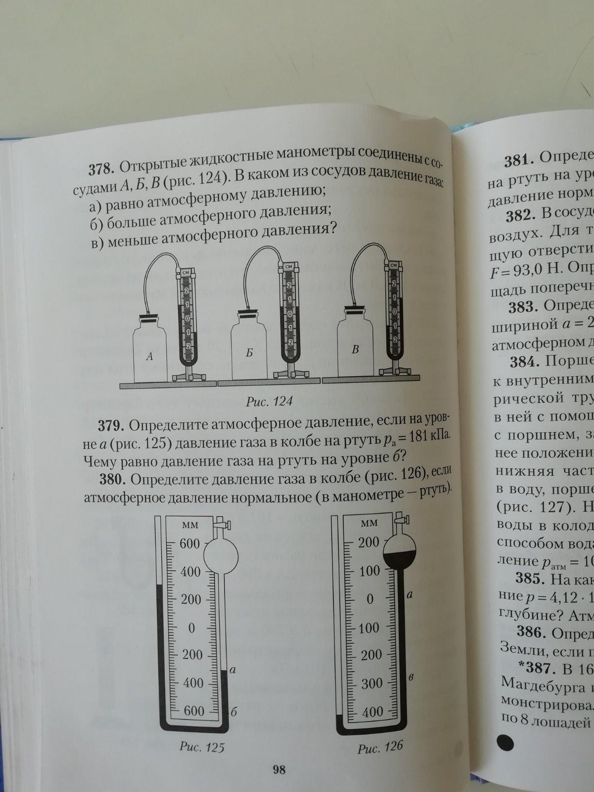 Определите атмосферное давление если на уровне А (рис. 125) давление газа в колбе на ртуть p=181кПа. Чему равно давление газа на ртуть на уровне Б