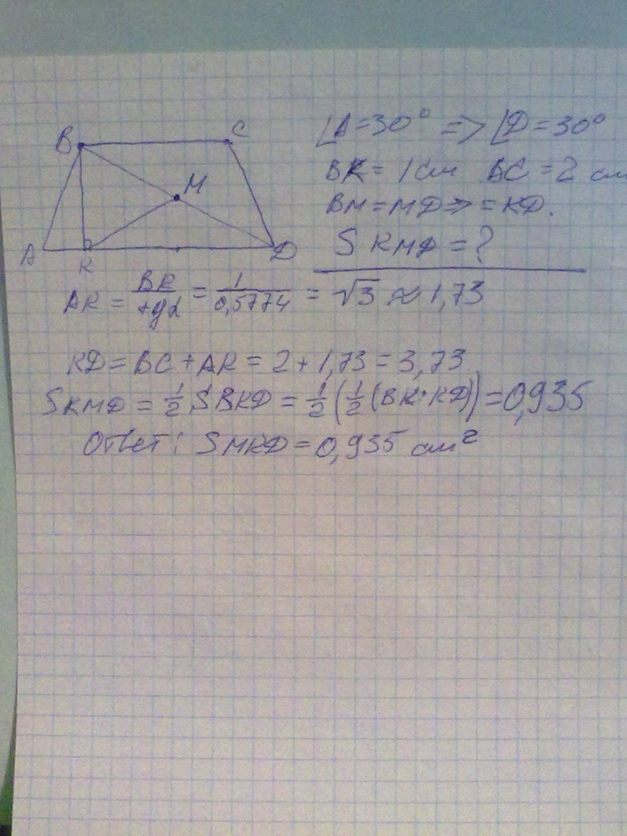В равнобедренной трапеции ABCD AD II ВС, A = 30°, высота ВК = 1 см, ВС= 2 см. Найдите площадь треугольника KMD, если М - середина отрезка BD.
