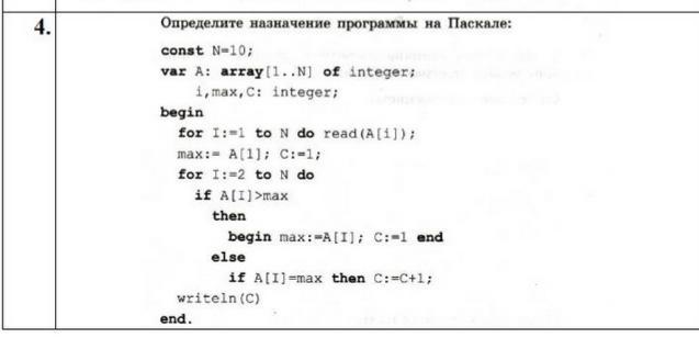 Имеются переменные i, max (намек на максимальное число), C, а также массив А