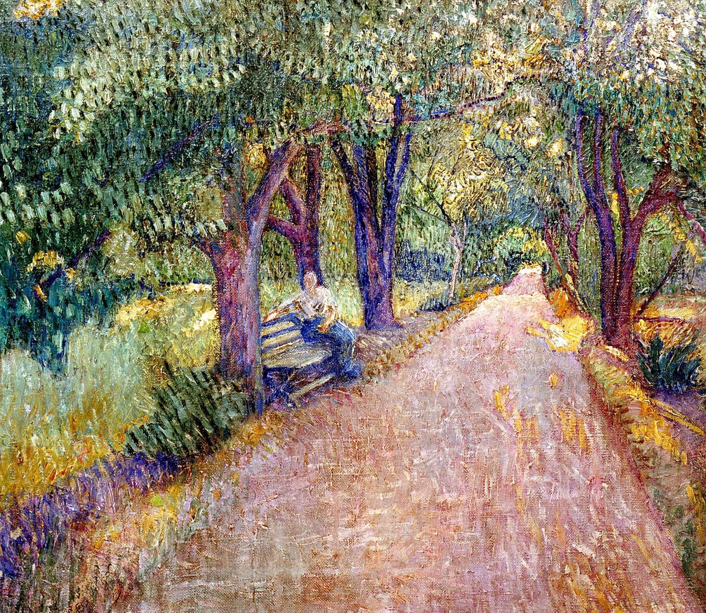 "Аллея в парке" – одна из многих работ художника Давида Бурлюка. На картине мы видим аллею. Около дерева, на скамейке, сидит задумчивый мужчина. Судя по картине, на улице тепло.