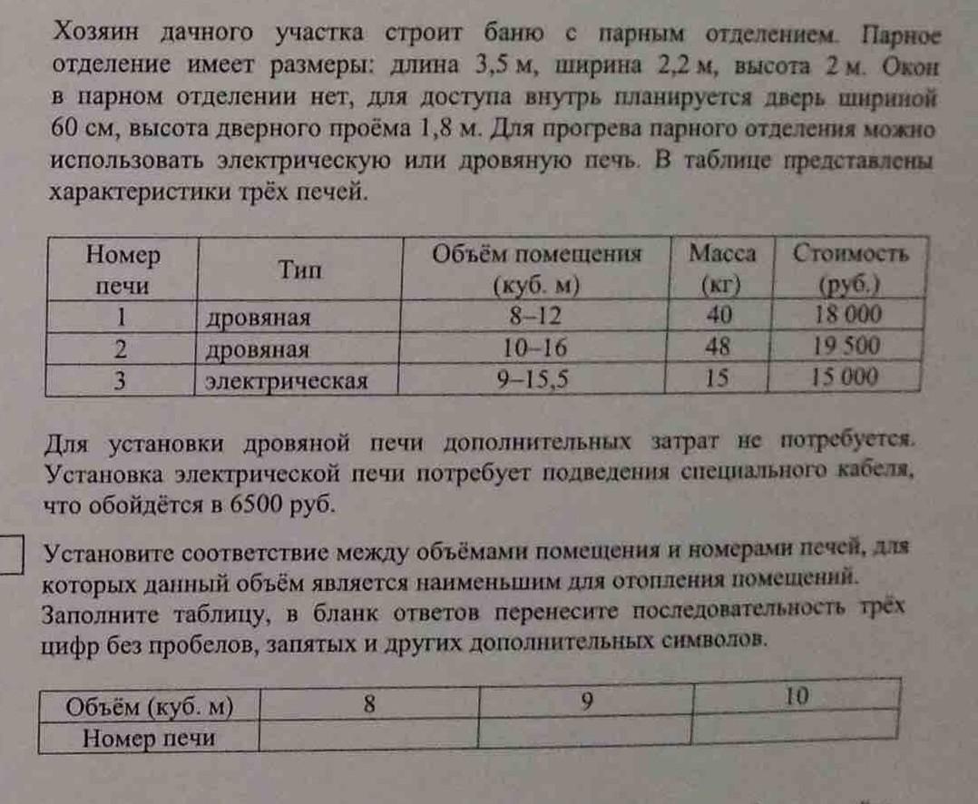 установите соответствие между объёмами помещения и номерами пичей для которых данный объём является наименьшим для отопления помещений.