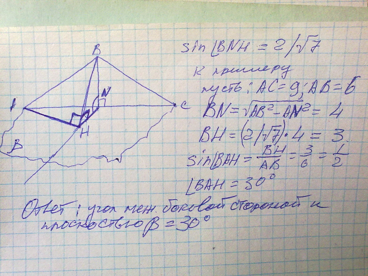 В равнобедренном треугольнике основание в 1,5 раза больше боковой стороны. высота треугольника, проведенная к основанию, образует с плоскостью бетта угол равный альфа, а основание треугольника лежит в плоскости бетта. найдите угол образованный боковой стороной треугольника с плоскостью бетта, если sin(альфа)=2/корень(7)