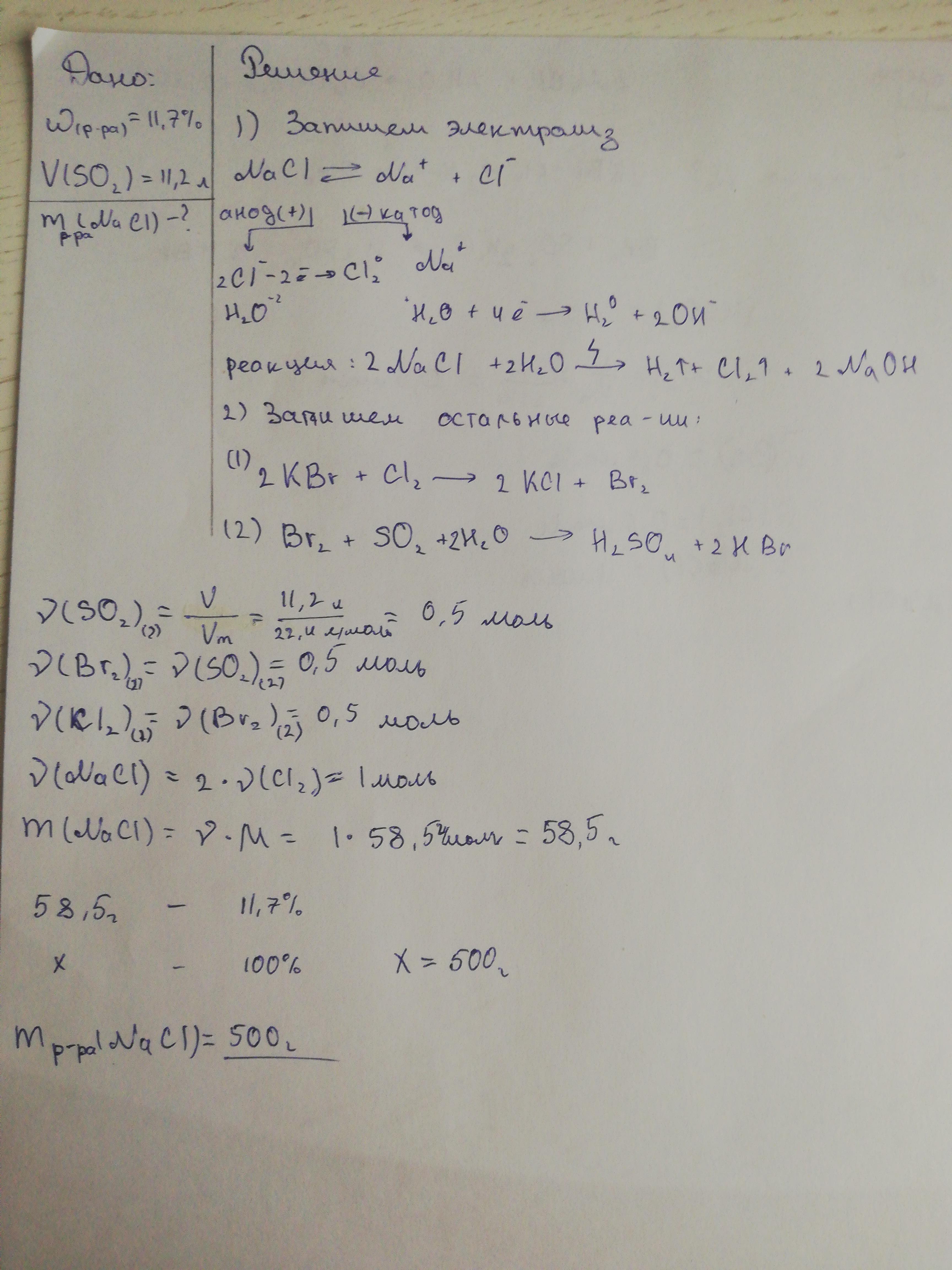 Раствор с массовой долей хлорида натрия 11,7% подвергли электролизу до полного разложения соли. Выделившийся на аноде газ пропустили через раствор KBr. Для обесцвечивания образовавшегося раствора понадобилось пропустить через него 11,2 л сернистого газа (н.у.). Определите массу исходного раствора.