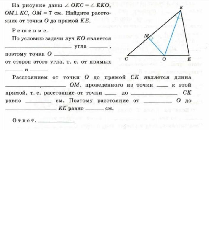 Луч является биссектрисой.угла К.Поэтому точка О отходит.От прямых СЕ и КЕ.Расстоянием от точки О до пр. СК явл длина отрезка ОМ.Из точки М.Т.е от точки М до прямой.Ск=7см.От точки О до прямой КЕ РАВНО 7