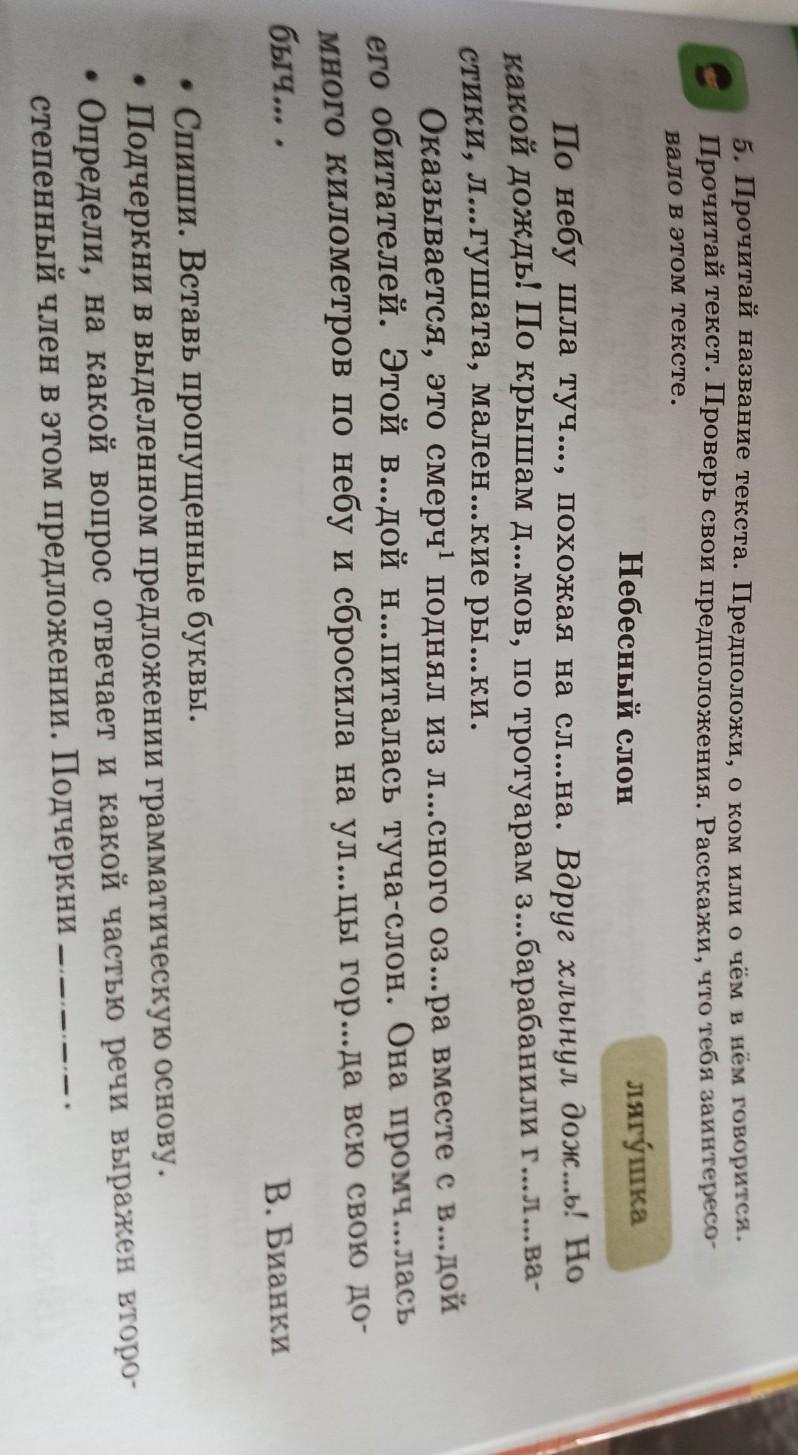 По небу шла туча(ча-ща пиши с а), похожая на слона (слОн). Вдруг хлынул дождь(дожди) ! Но какой дождь! По крышам домов(дОм) , по тротуарам забарабанили (приставка за) головастики (гОловы,голОвушка) ( , лягушата (словарное слово) , маленькие (ь знака как показатель мягкости согласного н)рыбки(рыба). Оказывается, это смерч поднял из лесного(лес) озера(озЁра) вместе с водой(вОдный) его обитателей. Этой водой(вОды) напиталась (приставка на-) туча-слон. Она промчалась(ча-ща пиши с а) много километров по небу и сбросила на улицы(словарное слово) города(иногорОдний) всю свою добычу(чу-щу пиши с у).