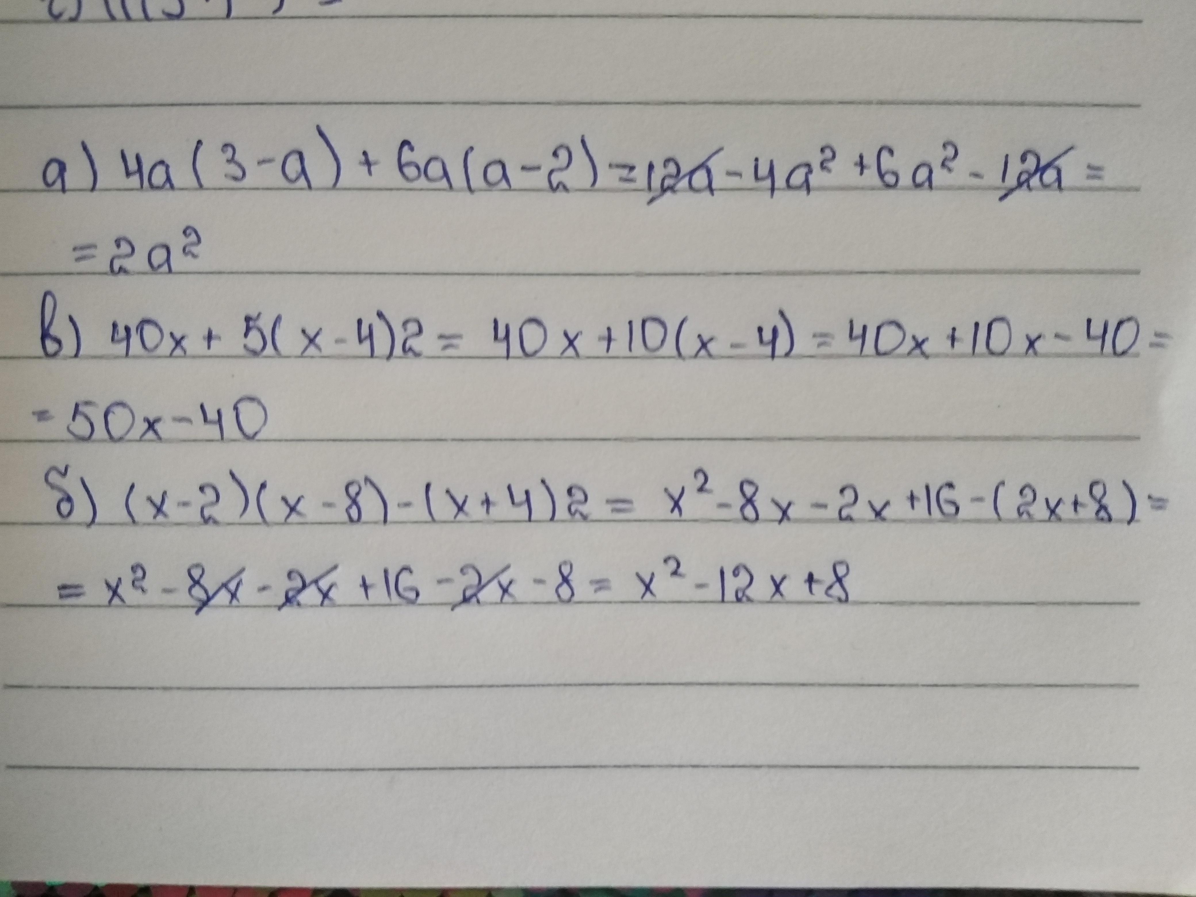 а) 4a (3 – a) + 6a (a – 2); в) 40x + 5 (x – 4) 2 .