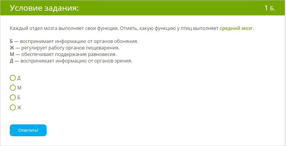 Каждый отдел мозга выполняет свои функции. Отметь, какую функцию у птиц выполняет средний мозг.
