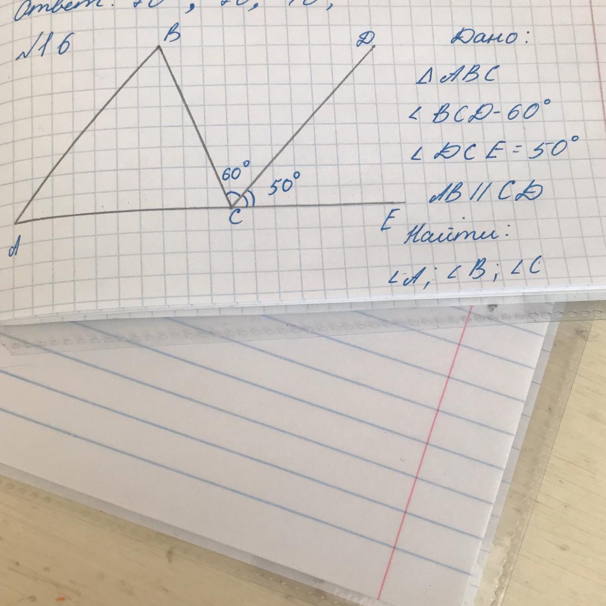 угол А и угол DCE соответственые, а значит равны.Чтобы найти угол С ,нужно прибавить 60+50=110 ,УголС равен 180-110=70.Чтобы найти угол В нужно от 180 отнять угол А и С .180-50-70=60градусов