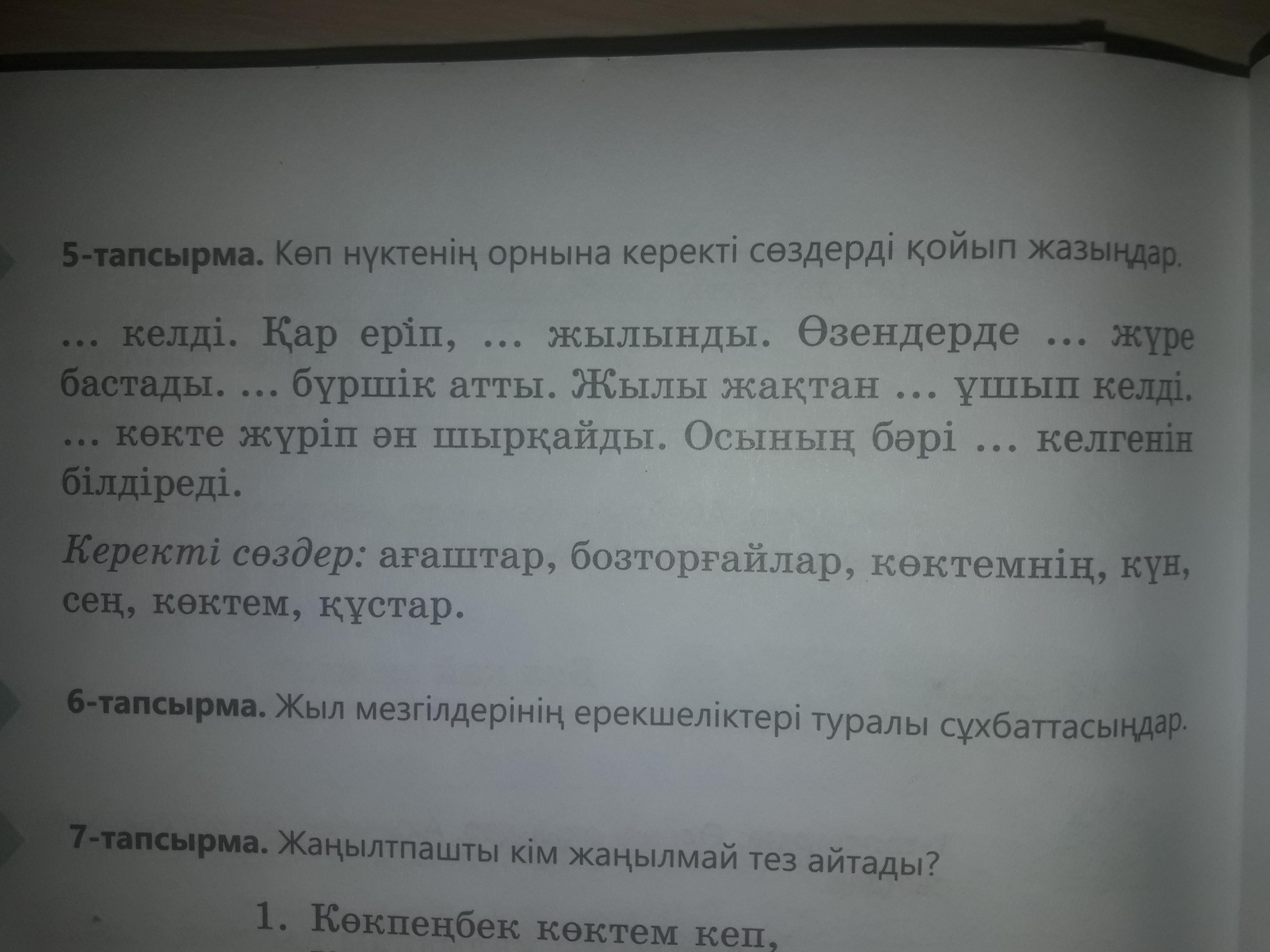 Көктем келді.Қар еріп, күн жылынды.Өзендерде сең жүре бастады. Ағаштар бүршік атты. Жылы жақтан құстар ұшып келді. Бозторғайлар көкте ж,ріп ән шырқайды. Осының бәрі көктемнің келгенін білдіреді.