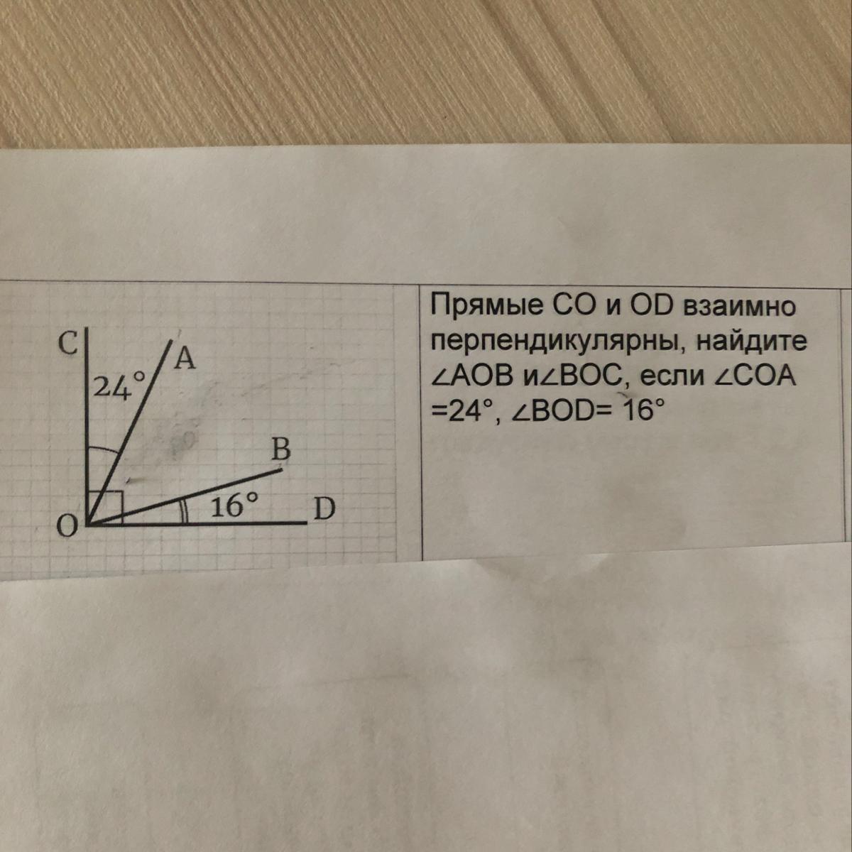 если CO и OD перпендикулярны то COD прямой, то его градусная мера будет 90. из этого следует, что AOB = 90- ( 24+16) = 50