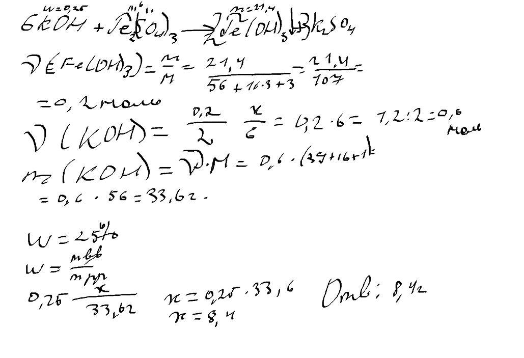 Какая масса 25% -ого раствора гидроксида калия потребуется для реакции с сульфатом железа(III), если при этом образуется 21.4 г осадка?