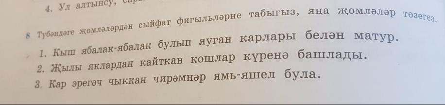 яуган, кайткан, чыккан. 1 урамда кар яуган. 2 кичэ абыем кайткан иде. 3 апаем урамга яулаксыз чыкка.