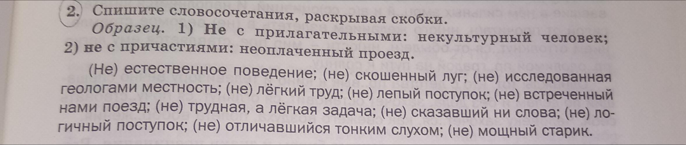 Ответ: Неестественное поведение; нескошенный луг; не исследованная геологами местность; нелёгкий труд; нелепый поступок; не встреченный нами поезд; не трудная, а лёгкая задача; не сказавший ни слова; нелогичный поступок; не отличавшийся тонким слухом; немощный старик.