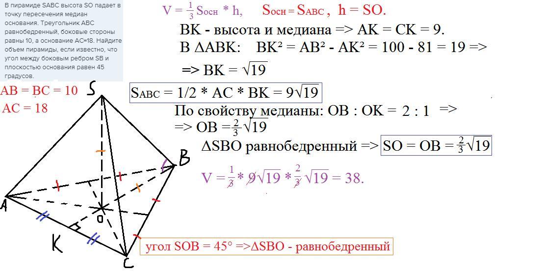 В пирамиде SABC высота SO падает в точку пересечения медиан основания. Треугольник ABC равнобедренный, боковые стороны равны 10, а основание AC=18. Найдите объем пирамиды, если известно, что угол между боковым ребром SB и плоскостью основания равен 45 градусов.
