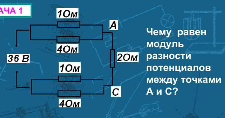 U2 = I×R2 = 10А×2Ом = 20В Это и есть разность потенциалов между точками А и С.