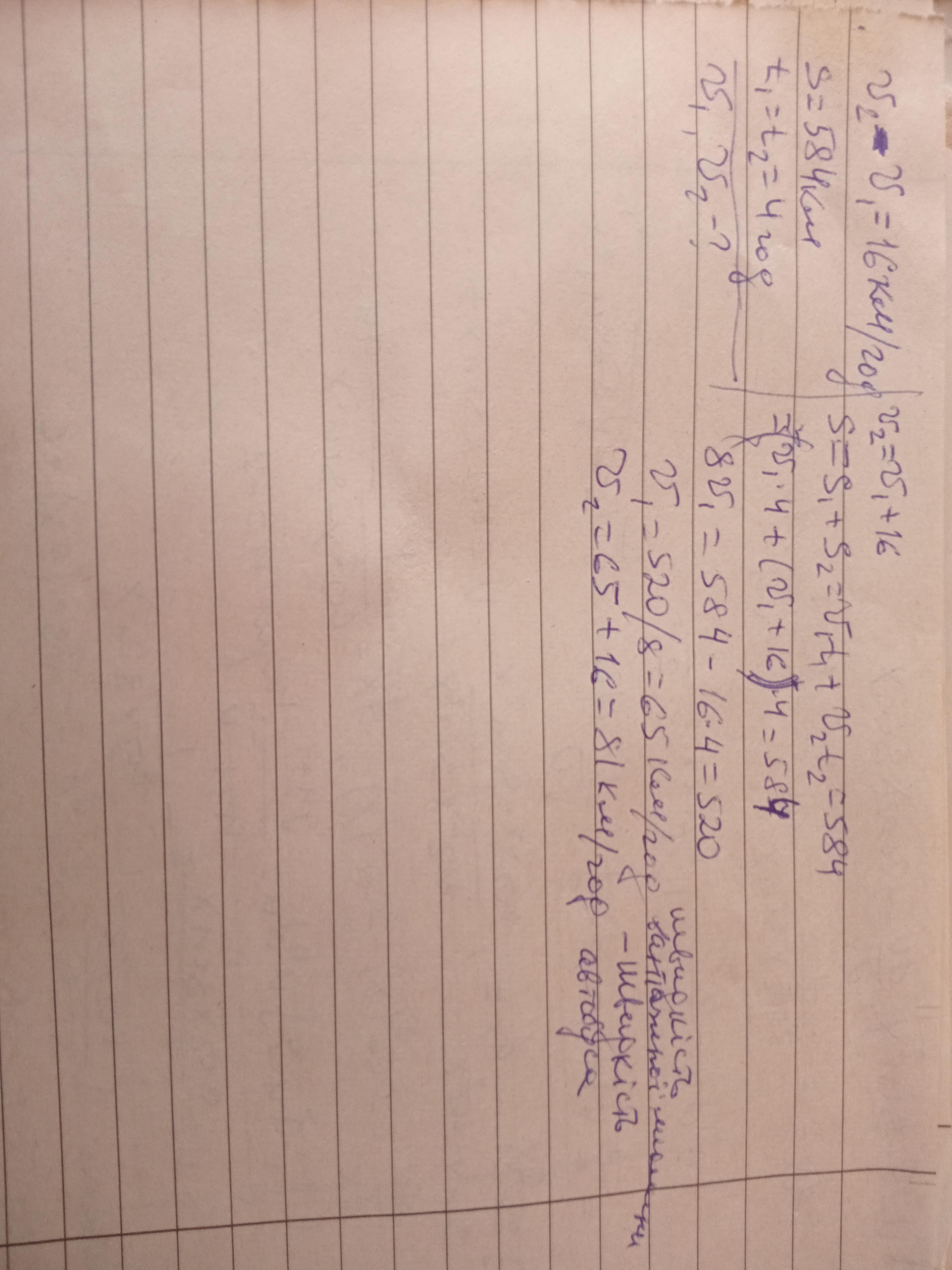 Автобус і вантажна машина, швидкість якої на 16 км/год більша від швидкості автобуса, виїхали одночасно назустріч одне одному із двох міст, відстань між якими складає 584 км. Знайди швидкості автобуса й вантажної машини, якщо відомо, що вони зустрілися через 4 год після виїзду.