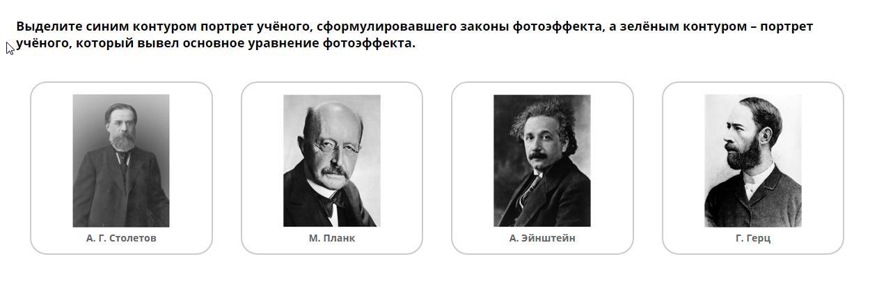 Выделите синим контуром портрет учёного, сформулировавшего законы фотоэффекта, а зелёным контуром – портрет учёного, который вывел основное уравнение фотоэффекта.