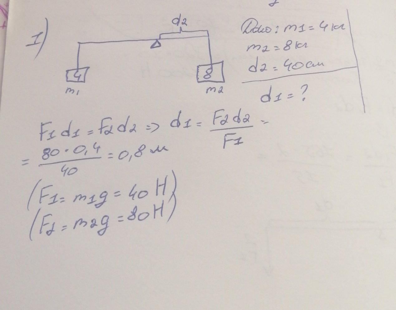 К концами рычага подвешаны 2 груза 4 и 8 кг. Длина меньшего плеча 40 см. Какова длина большего плеча. Пожалуйста с решением.