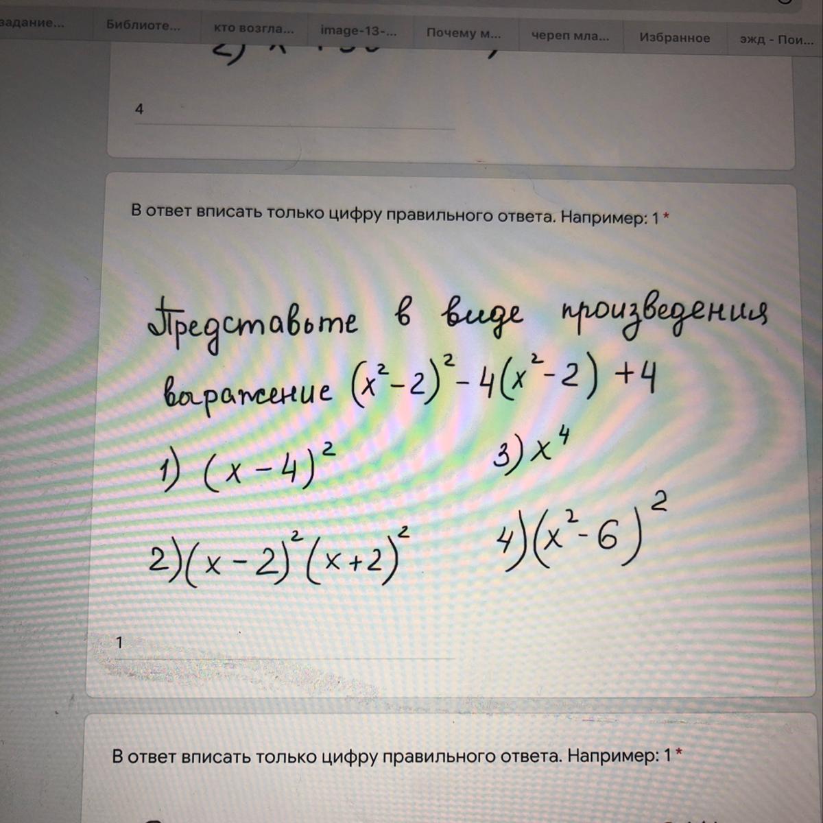 x⁴-4x²+4-4x²+8+4=x⁴-8x²+16=(x²-4)², но такого нове та почему-то нет. подозреваю, что ответ 1, просто с опечаткой