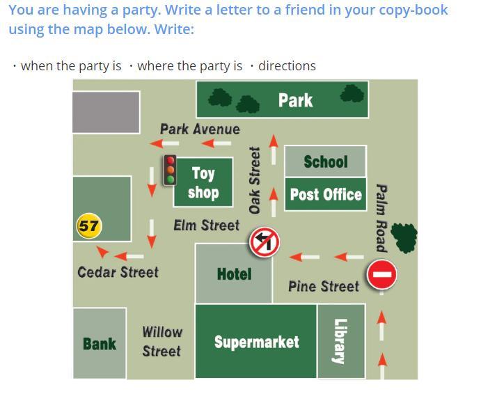 we might go straight from our house and turn left From Library go straight from pine street turn right from Hotel go straight from post office turn left from parkturn left fromtoy shopgo straightturn leftand you come to cadar street
