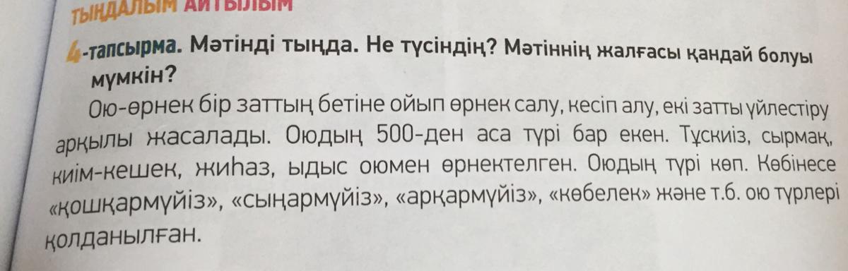 Олардың аса маңызды элементтері: қошқар мүйіз, құс таңдай, түйе табан, үш жапырақты, бес жапырақты, т.б. Ою-өрнектің геометриялық элементтері шаршы, ромбы, жұлдызша түрінде), сондай-ақ, көкөніс өрнектері (гүл, жапырақ, бұтақ түрінде) ағаш ұқсатуда, әсіресе үй жиһазы мен ыдыс-аяқтарда, музыка аспаптары , білезік) кездеседі.