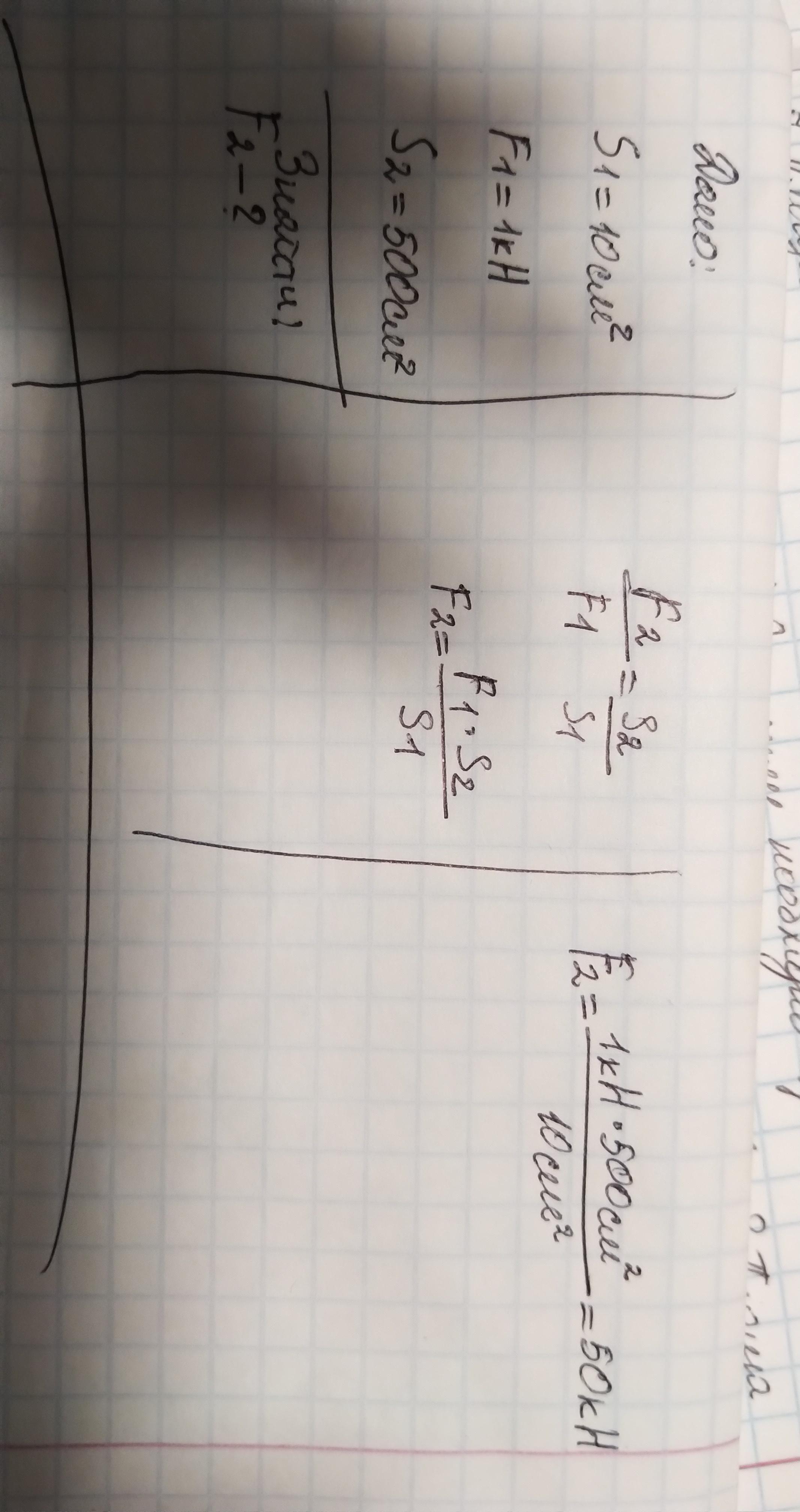 Площа малого поршня гідравлічної машини 10 см, на нього діе сила 1 кН Яку силу необхідно прикласти до великого поршня, щоб поршні були в рівновазі? Площа великого поршня 500 см?.