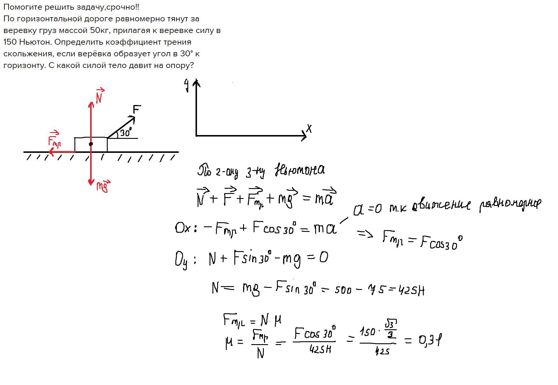 По горизонтальной дороге равномерно тянут за веревку груз массой 50кг, прилагая к веревке силу в 150 Ньютон. Определить коэффициент трения скольжения, если верёвка образует угол в 30° к горизонту. С какой силой тело давит на опору?