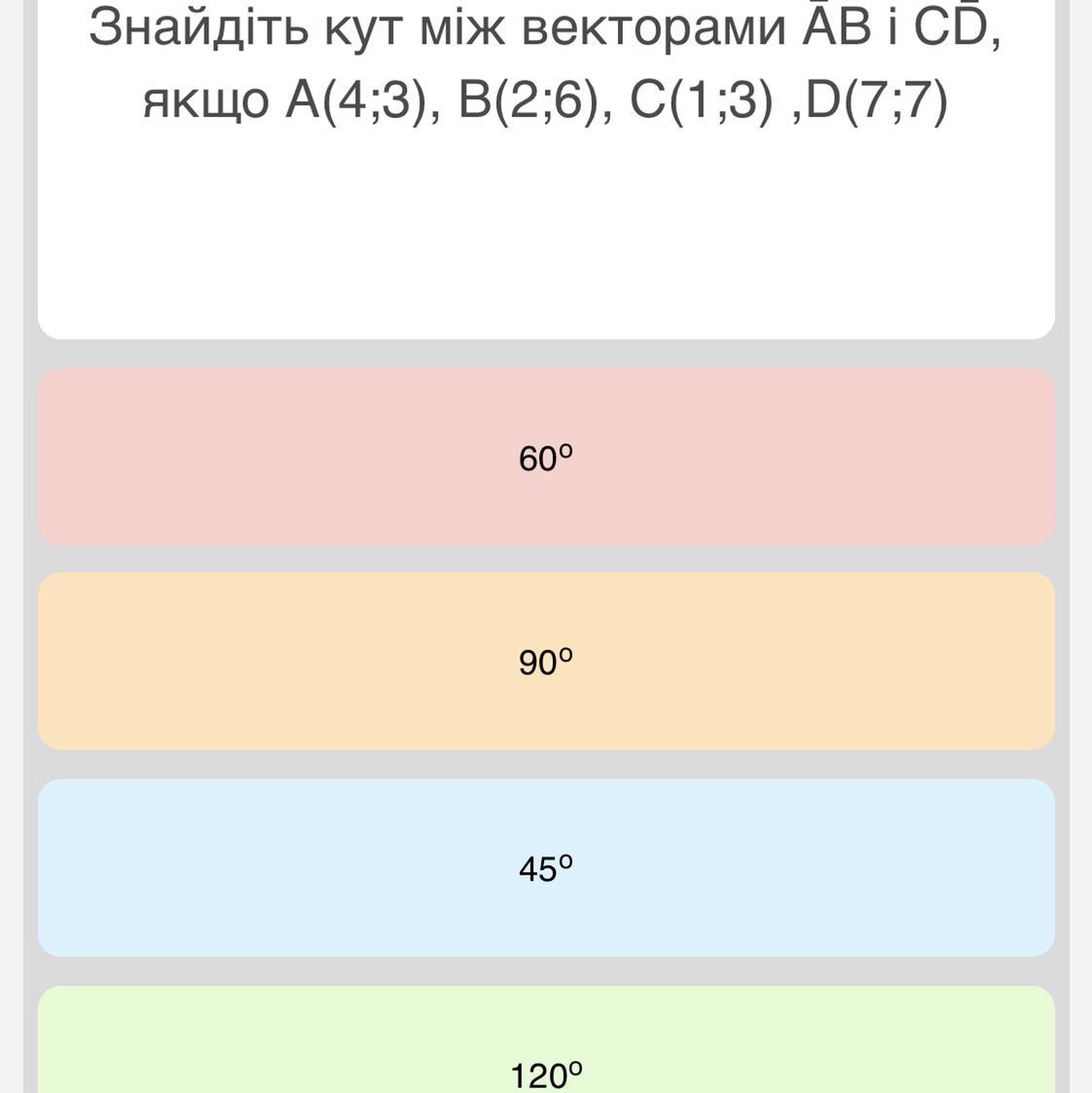 Знайдіть кут між векторами AB і CD, якщо A(4;3) B(2;6) C(1;3) D(7;7)