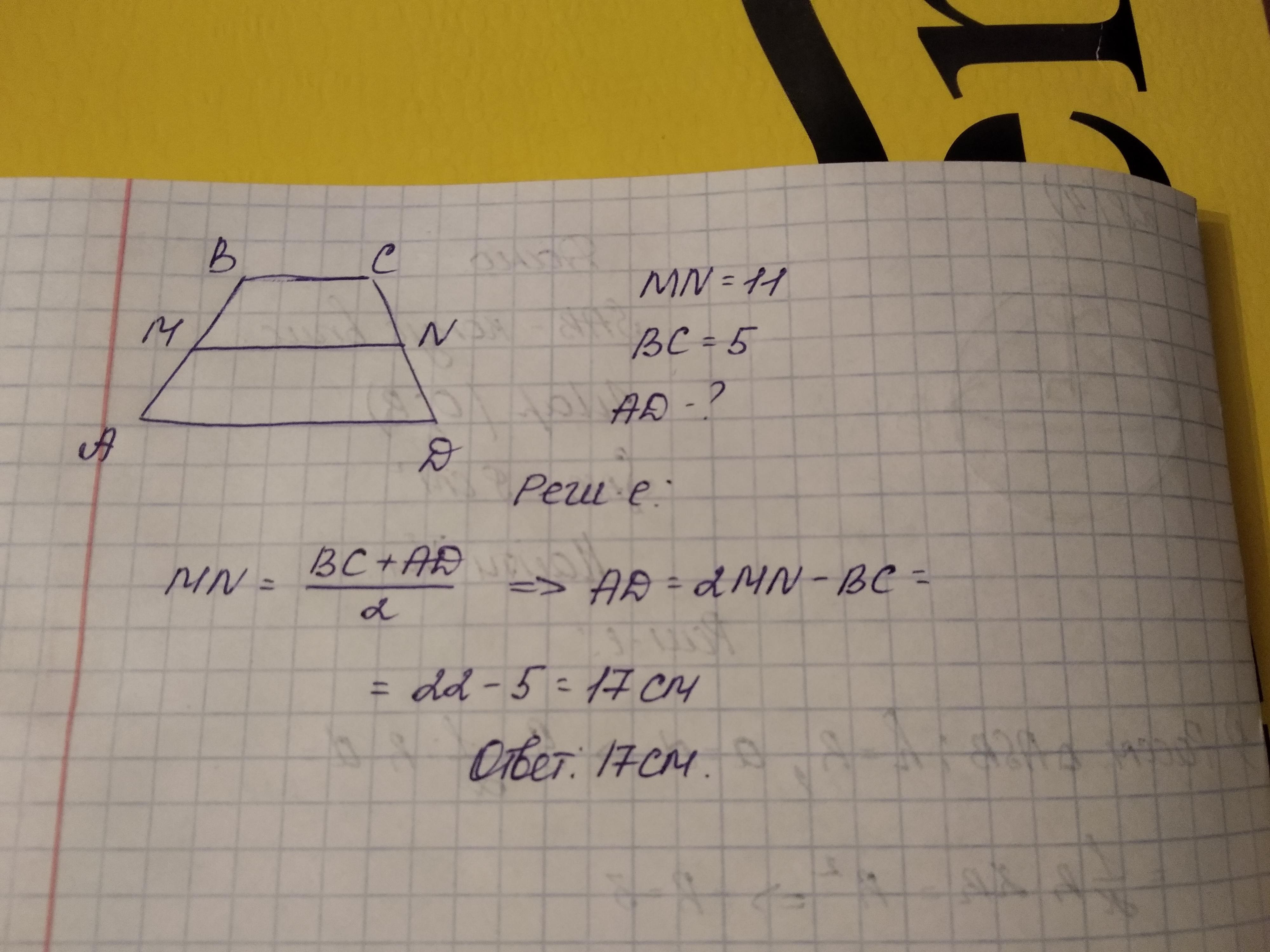 3. Средняя линия трапеции равна 11, а меньшее основание равно 5. Найдите большее основание. И можно пожалуйста с картинкой?