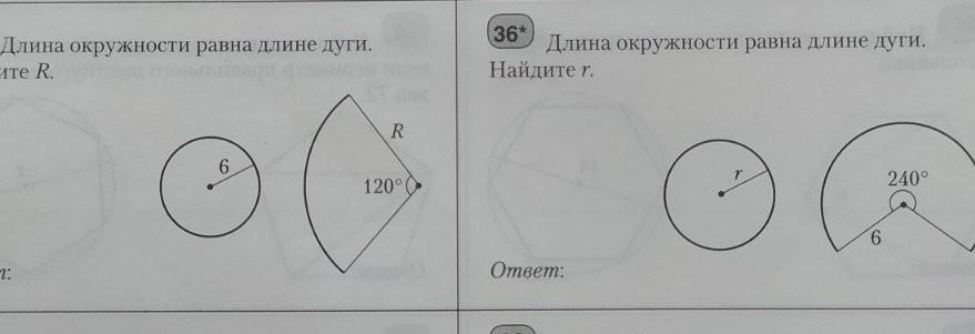 Длина окружности равна длине дуги. Найдите R(в левой) и r (в правой) ​