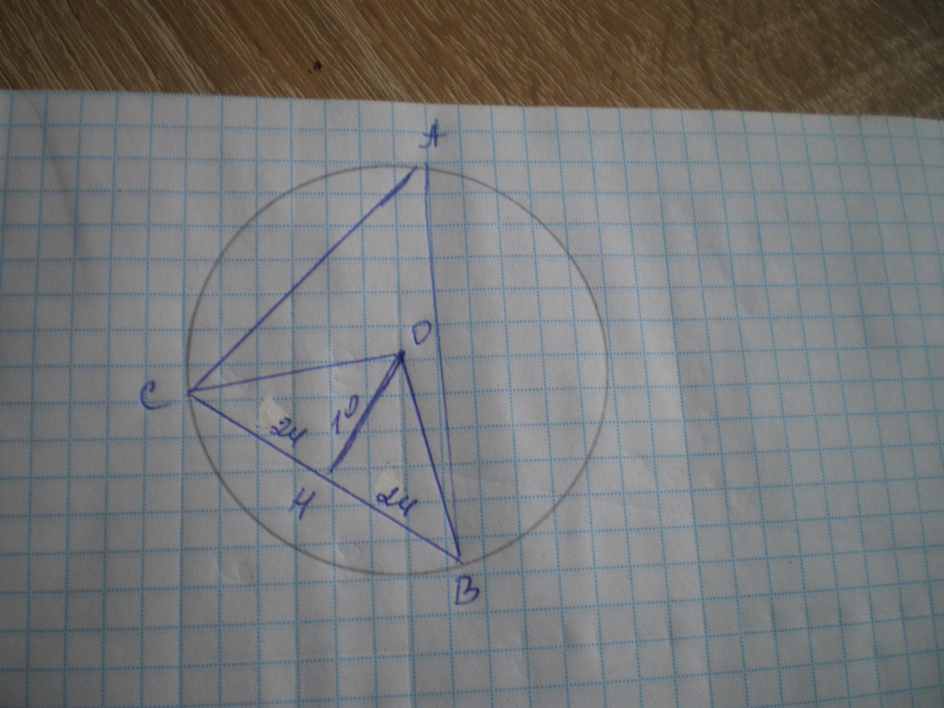 В треугольнике АВС расстояние от центра описанной окружности до стороны ВС равно 10 см. Найдите радиус описанной окружности, если BC = 48 см. Ответ дайте в сантиметрах.
