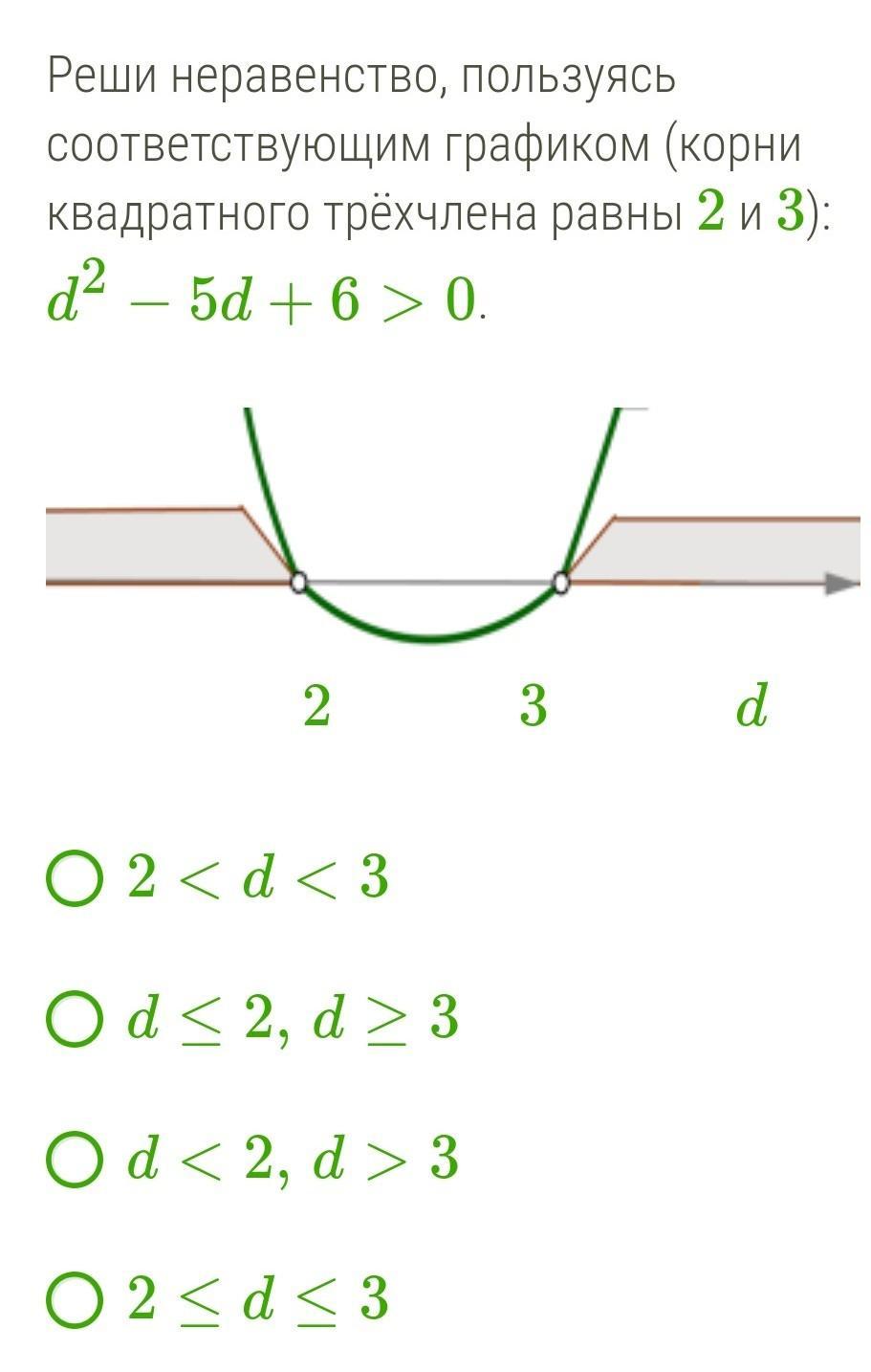 Реши неравенство, пользуясь соответствующим графиком (корни квадратного трёхчлена равны 2 и 3):