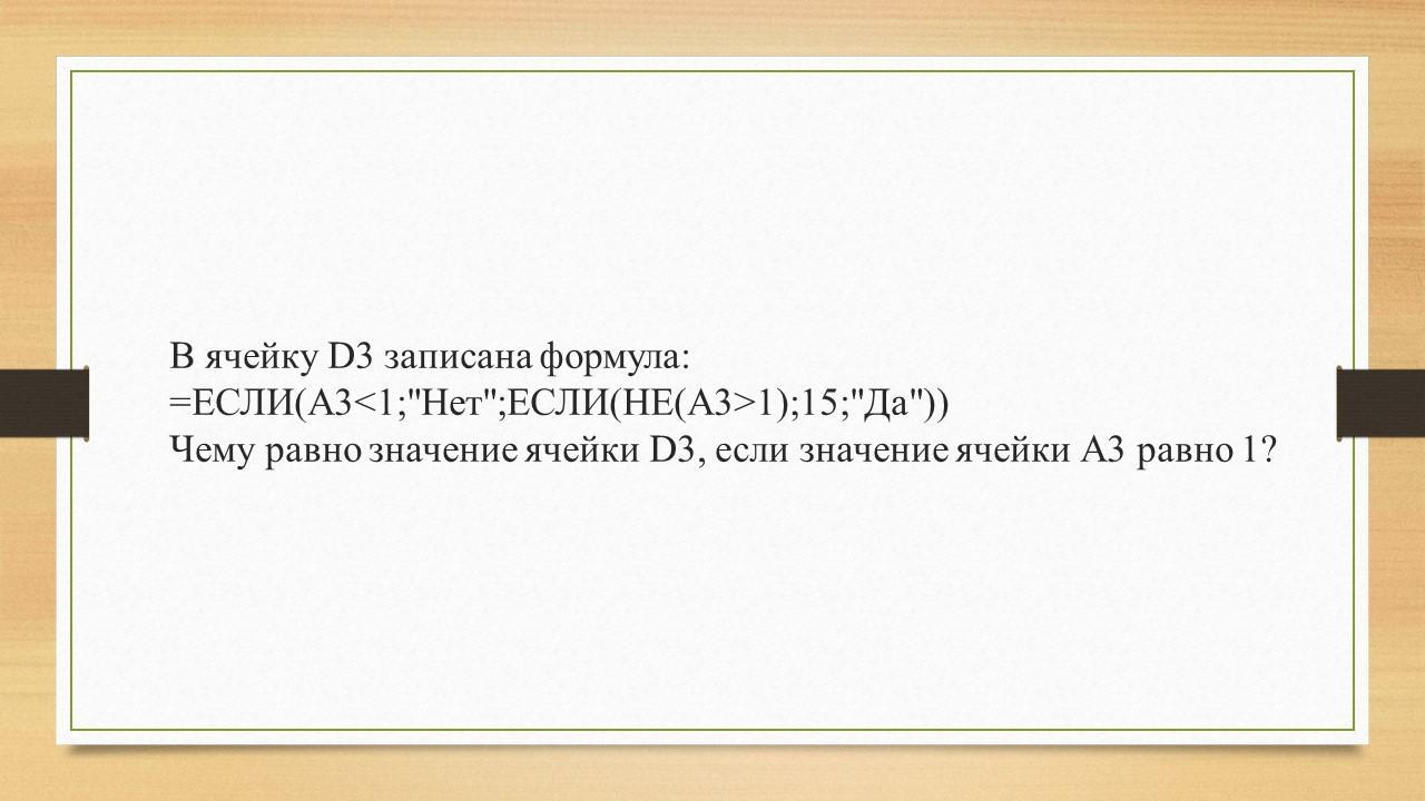 Чему равно значение ячейки D3, если значение ячейки А3 равно 1?