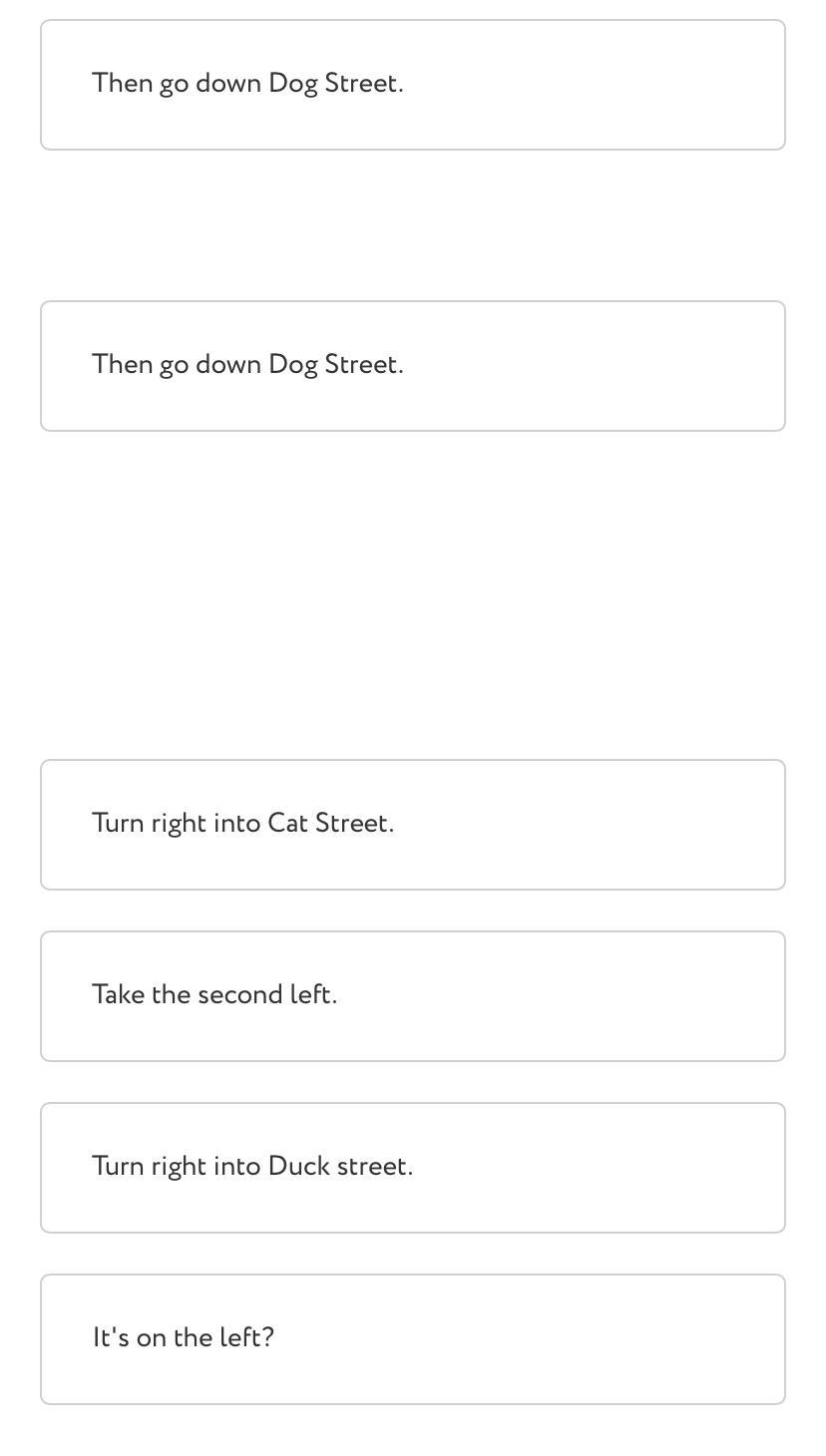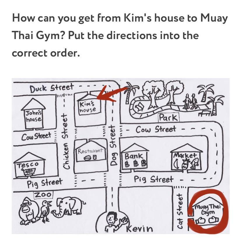 Помогите! Английский язык! Нужно добраться от дома Ким (стрелка) до спортивного зала (круг), расставляя эти 5 действий по порядку