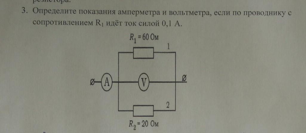 Определите показания амперметра и вольтметра, если по проводнику с сопротивлением R1 идёт ток силой 0.1А. Помогите пожалуйста, очень срочно надо