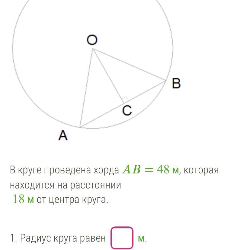 Треугольник AOB - р/б, т.к. AO=OB(радиусы окр.). Следовательно, OC является и медианой(по св-ву р/б треуг.). AC=CB=24м. По теореме пифагора в треугольнике OCB находим радиус=30м. Площадь = pi*r^2, т.е Площадь = pi*900=900pi.