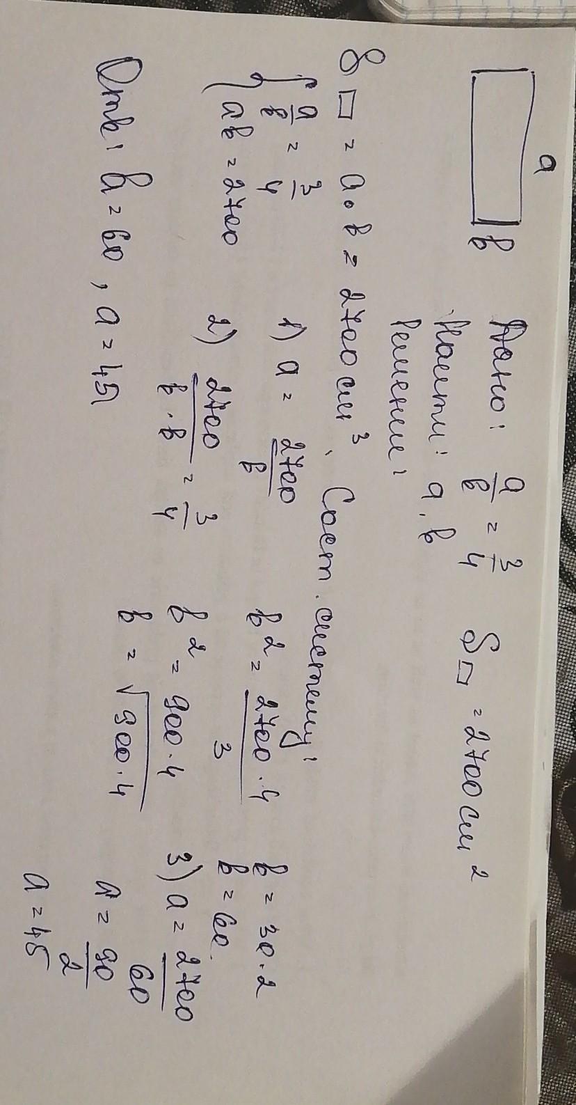 Чему равны стороны прямоугольника a и b, если они соотносятся как 3 : 4, а площадь прямоугольника равна 2700 см2?
