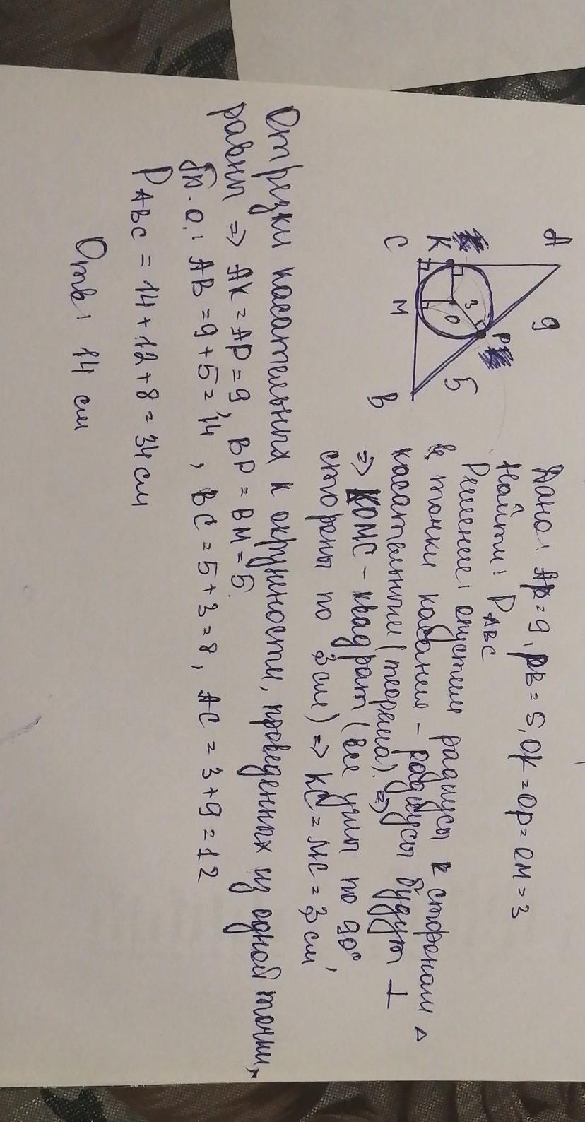 «В прямоугольном треугольнике точка касания вписанной окружности делит гипотенузу на отрезки 5 см и 9 см. Найдите периметр треугольника, если радиус окружности равен 3 см