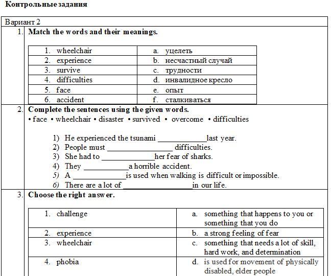 Первое : 1d 2e 3a 4c 5f 6a Второе: 1.disaster, 2.overcome, 3.face, 4.survived, 5.wheelchair, 6. Difficulties Третье: 1a 2c 3d 4b