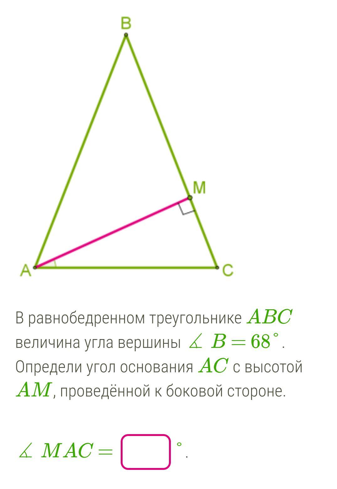 Так как треугольник abc равнобедренный, то углу при основании равны. Сумма всех углов треугольника равна 180°. Следовательно на угол А и угол С вместе приходится 180-68=112. Делим на 2 и получаем. Угол А= угол С= 56. Треугольник АМС прямоугольный., Следовательно на два угла (прямой отпадает) приходится 90°. Но угол С мы уже знаем. Находим угол МАС =90-56=34°